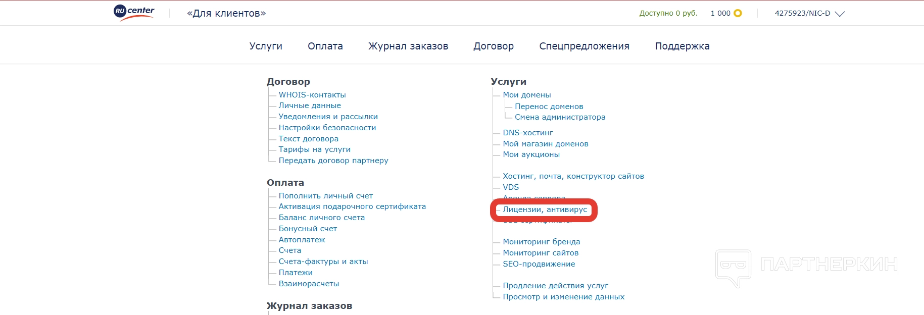 Лицензии, антивирус — в этом разделе можно оформить заказ на антивирус.