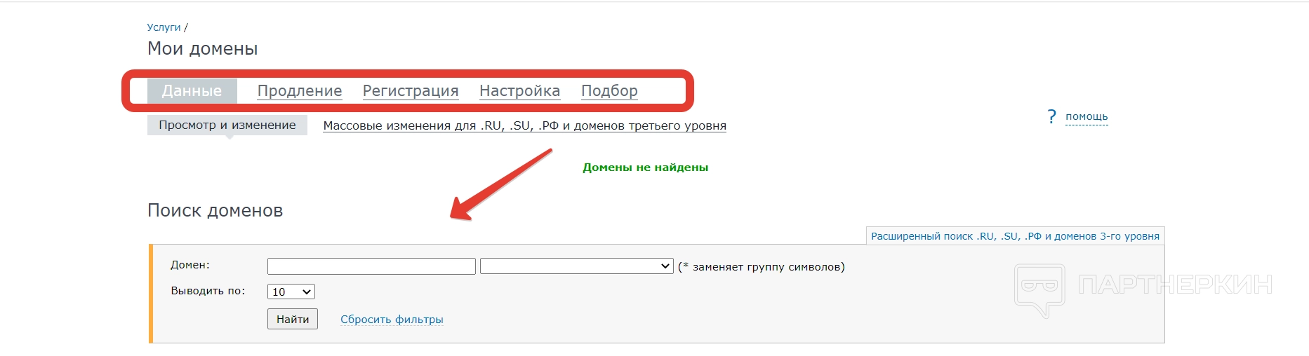 Каждый пункт можно открыть и просмотреть. В пункте «Мои домены» можно поискать нужный домен, который пользователь только хочет зарегистрировать. Для этого вводится название и указывается доменная зона. Кроме того, здесь можно продлить домен, настроить его или сразу зарегистрировать.