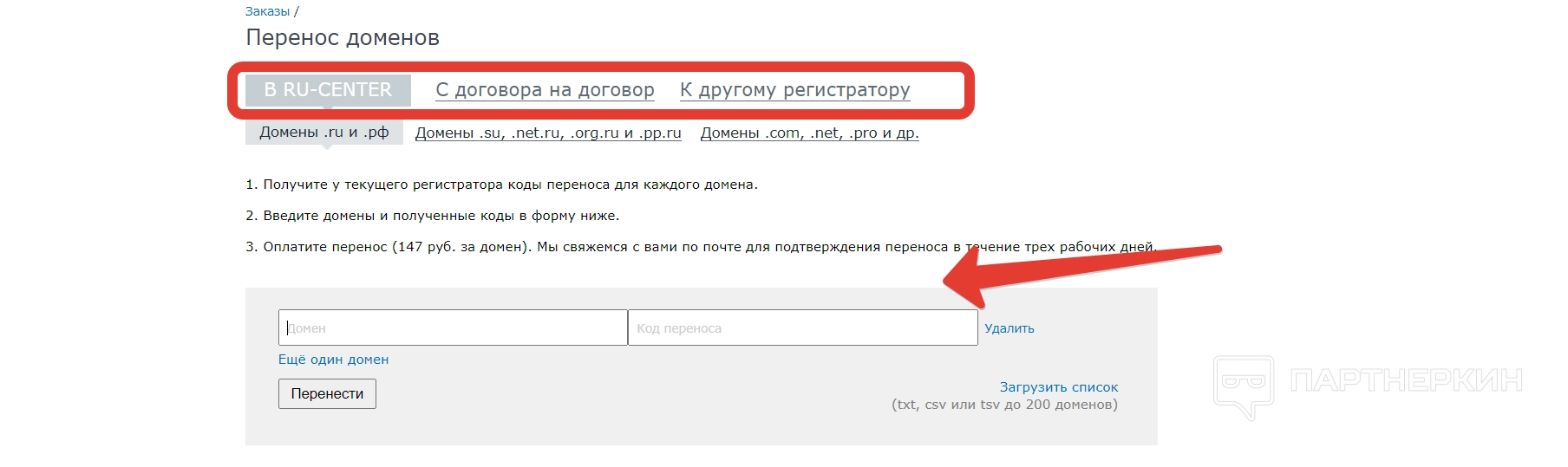 Перенос домена позволяет перенести домен, который был зарегистрирован на другом хостинге. Например, с хостинга REG.RU на хостинг RU-CENTER. Для исполнения услуги нужен код переноса — его запрашивают на бывшем хостинге. Также можно перенести домен с