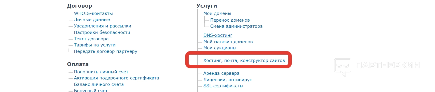Хостинг, почта, конструктор сайтов — в этом разделе собрали функции по заказу хостинга, почты для сайта, а также конструктора сайтов.
