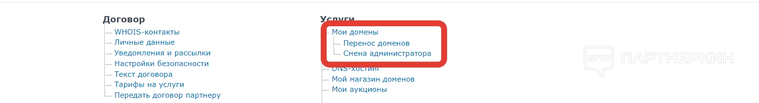 Мои домены — в этом разделе можно перенести домен на хостинг RU-CENTER, а также сменить его администратора.