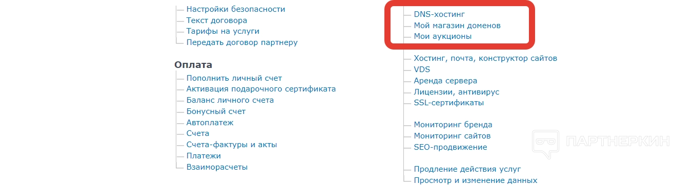 DNS-хостинг — в этом разделе также есть пункты «Мой магазин доменов», в котором можно продавать купленные домены другим пользователям, и «Мои аукционы», где можно быстро выкупить освободившееся домены или предварительно заказать их.