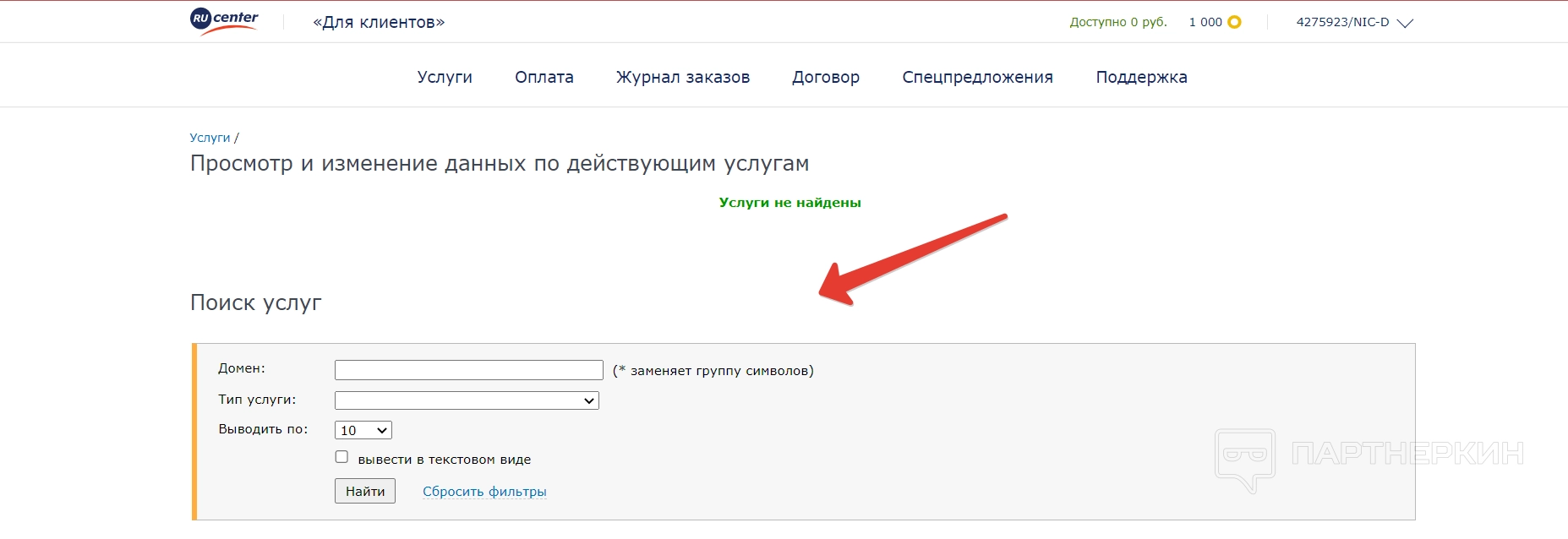 Просмотр и изменение данных — если пользователь оформлял услуги, то в этом пункте он может их все просмотреть и изменить по необходимости. Например, купить другой хостинг для своего домена. Кроме того, тут можно искать услуги и сразу заказывать их.