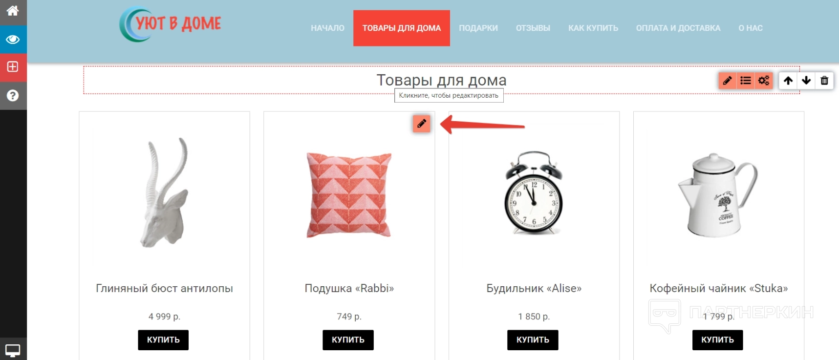 Обычно на многих сайтах или в полноценных интернет магазинах есть раздел со списком товаров. В шаблоне на примере это предусмотрено, поэтому можно найти карточки товаров. Их редактирование происходит несколько иначе — нужно тапнуть на карандаш на карточке и перейти в пункт редактирования.