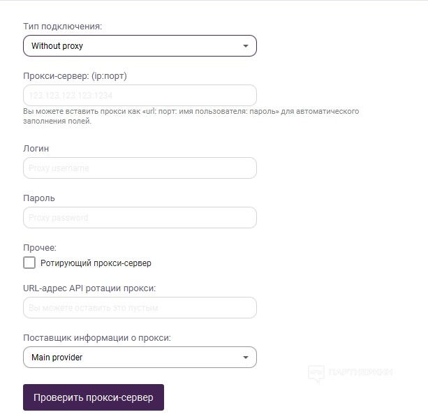 Прокси-сервер. Пользователи, работающие без прокси, пропускают этот пункт. Другие юзеры выбирают прокси-сервер, указывают логин, пароль и заполняют оставшуюся информацию.