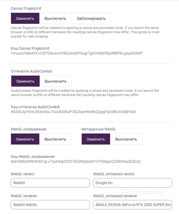 Оборудование. Параметры Canvas Fingerprint, AudioContext, WebGL-изображение и метаданные WebGL нужно заменить. Эти функции уже выставлены по умолчанию.