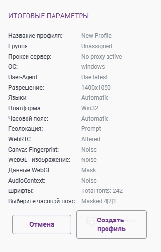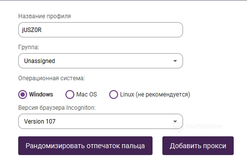 Обзор. Здесь нужно указать название профиля, выбрать группу (если требуется), операционную систему, версию браузера и нажать «рандомизировать отпечаток пальца» (по желанию).