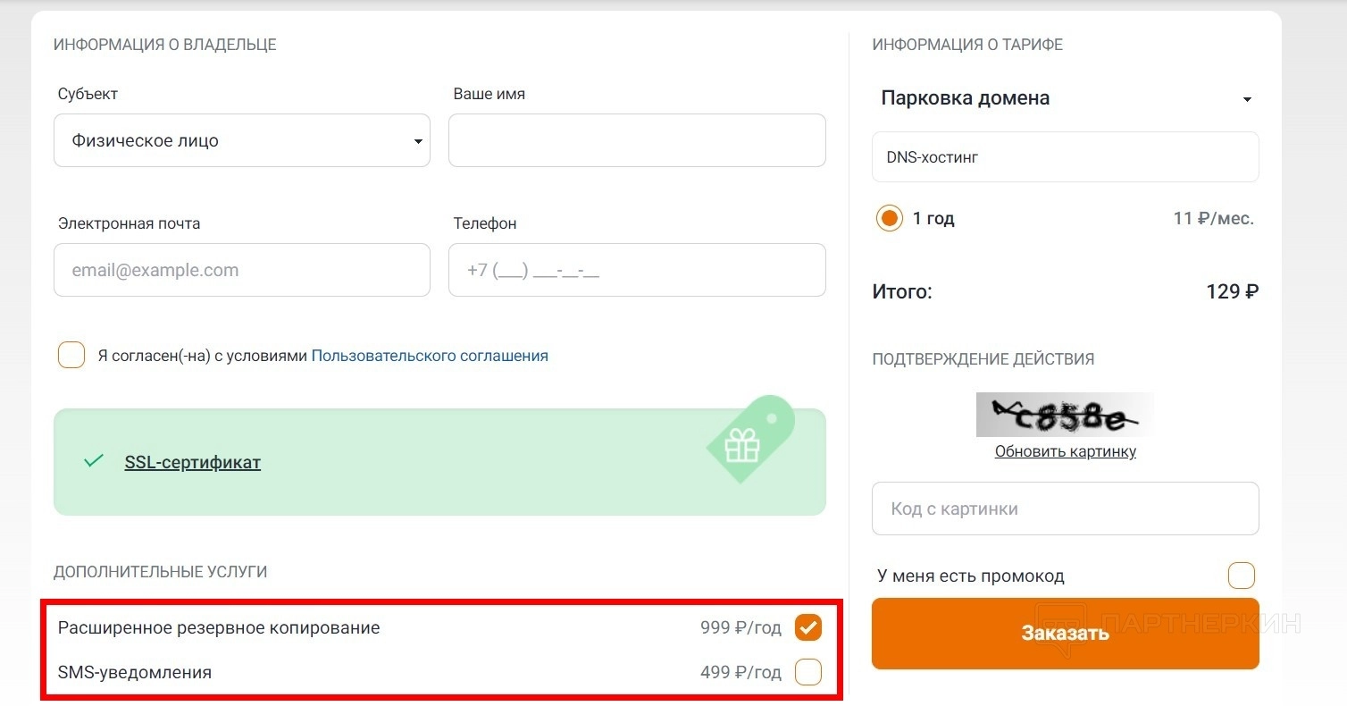 - Выберите дополнительные услуги (по желанию).