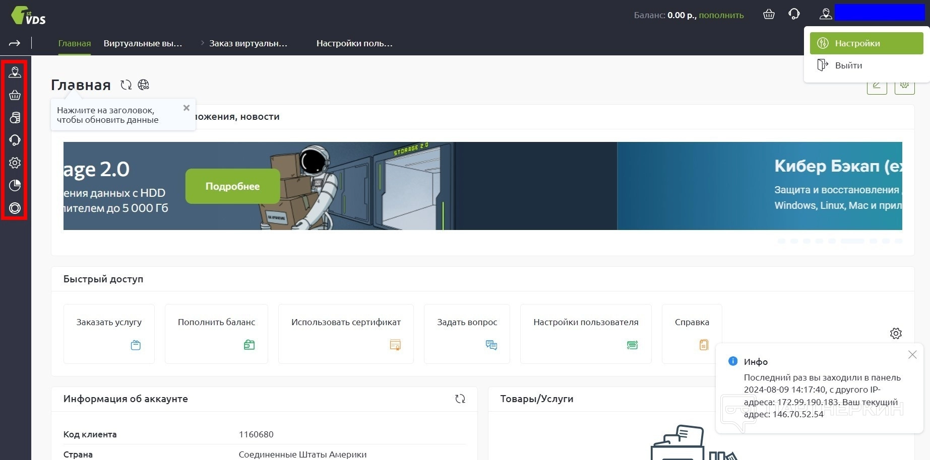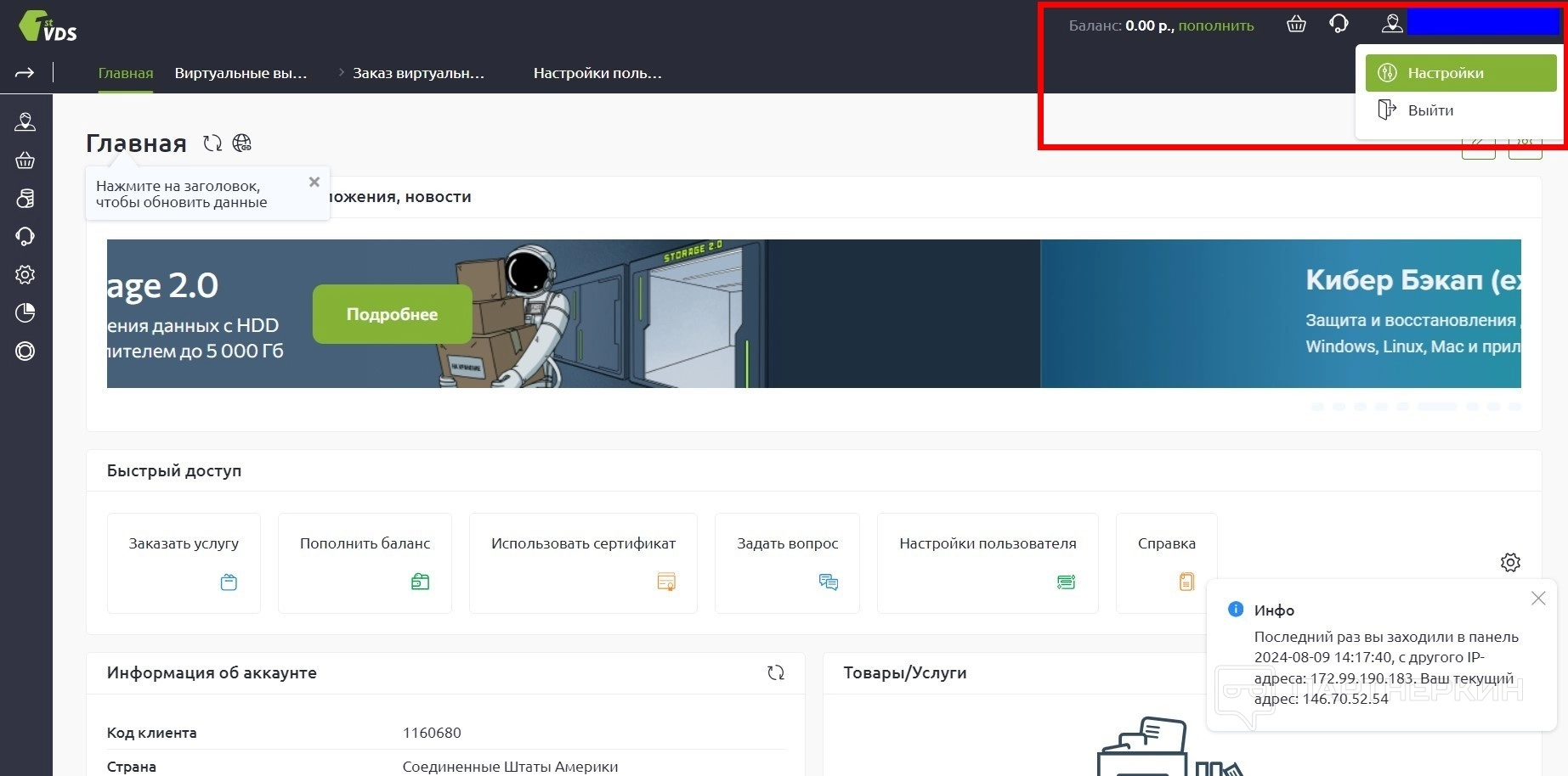 Компания предоставляет доступное и удобное техническое решение для управления виртуальными серверами. Через личный кабинет можно выполнять все операции: начиная от пополнения баланса и заканчивая настройкой VPS/VDS. Попасть в личный кабинет можно через главную страницу после регистрации аккаунта.