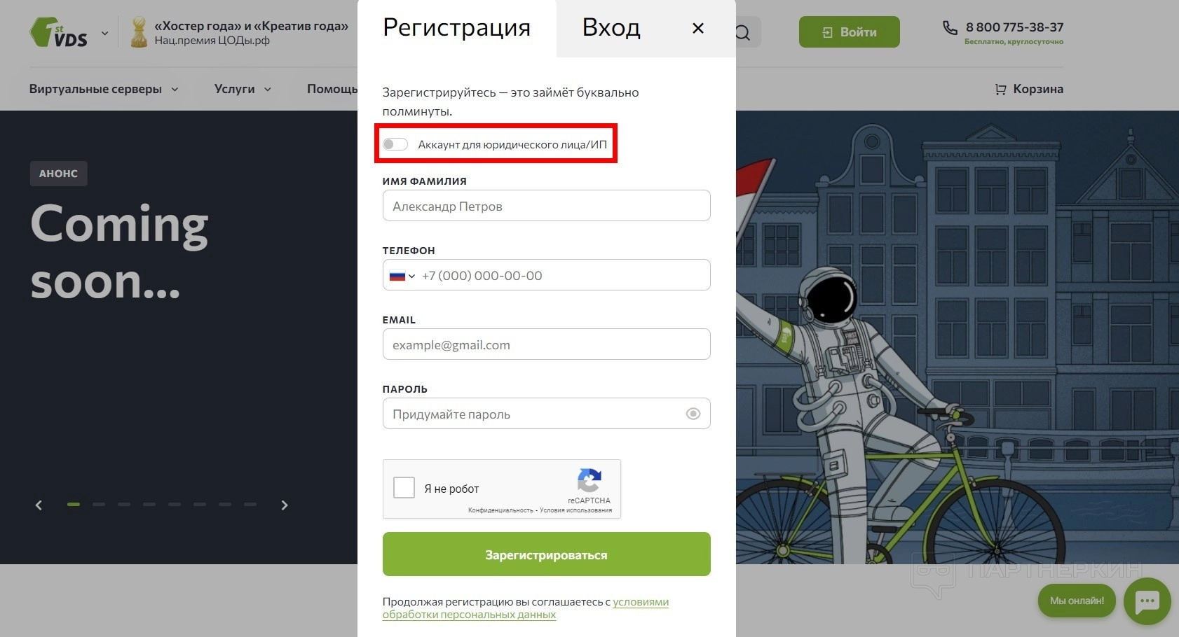 - Переведите ползунок, в зависимости от типа регистрации: для частных или юридических лиц.