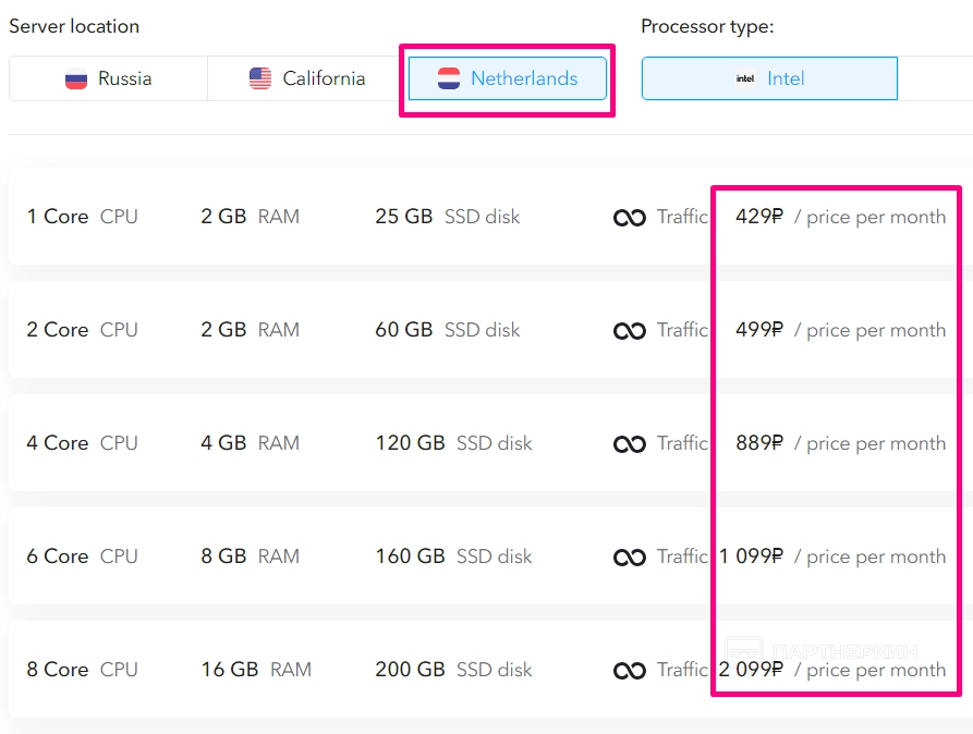 предлагает несколько тарифных планов на VPS в России, обеспечивая оптимальное соотношение цены и производительности. Все планы включают процессоры Intel, высокоскоростные NVMe-диски и неограниченный трафик.