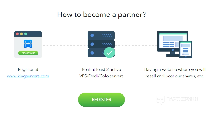 Для этого нужно зарегистрироваться на сайте и арендовать не менее 2-х активных VPS серверов, после чего можно будет стать партнером. Важным условием является наличие у пользователя веб-сайта, на котором он сможет размещать информацию о сервисе.