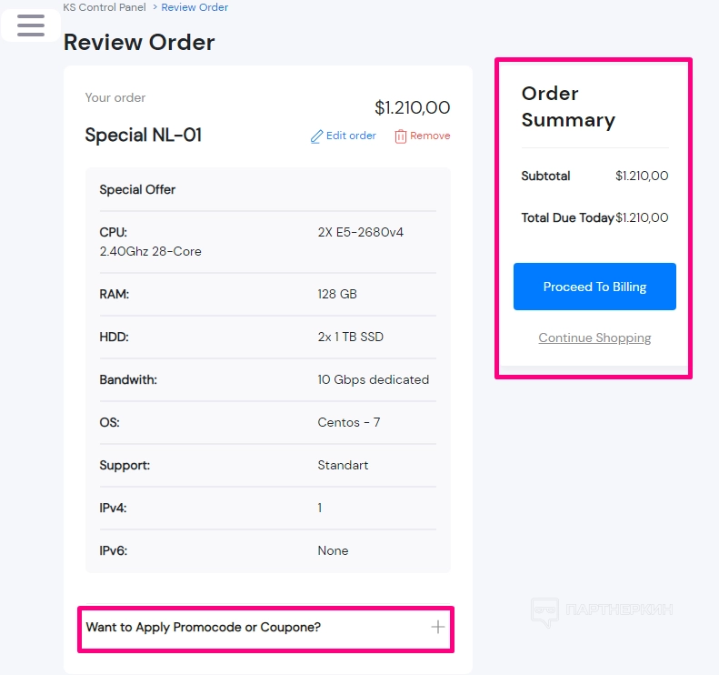 После выбора нужных конфигураций можно будет увидеть точную стоимость услуги и в новом поле ввести купон или промокод для получения скидки: