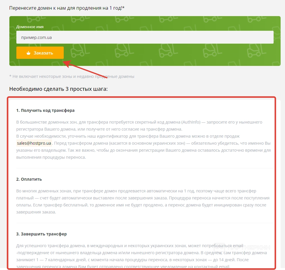 - Перенести домен. В это вкладке осуществляется перенос доменов. Для малоопытных пользователей представлена инструкция из 3 шагов.