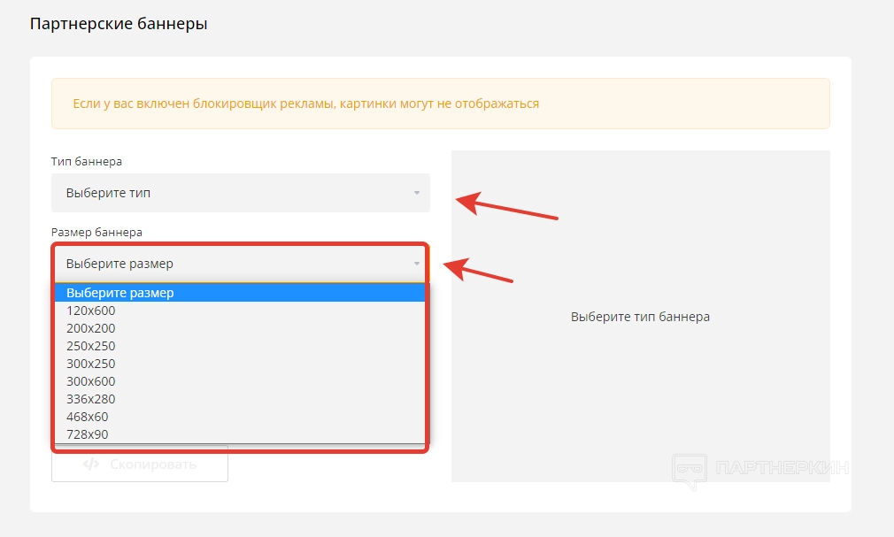 Баннеры, кстати, можно выбирать самостоятельно. Пользователь может указывать не только тип (VPS, хостинг), но и размер рекламного материала. Для этого есть соответствующий блок.