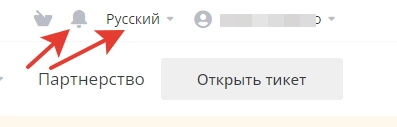 Чтобы попасть в настройки, следует воспользоваться верхней панелью управления. Слева от названия аккаунта есть колокольчик, который уведомляет о полученных сообщениях. Сообщения, как правило, приходят от службы поддержки или в случае оплаты каких-либо услуг. Рядом с колокольчиком есть переключатель языков, где можно выбрать русский, украинский и английский.