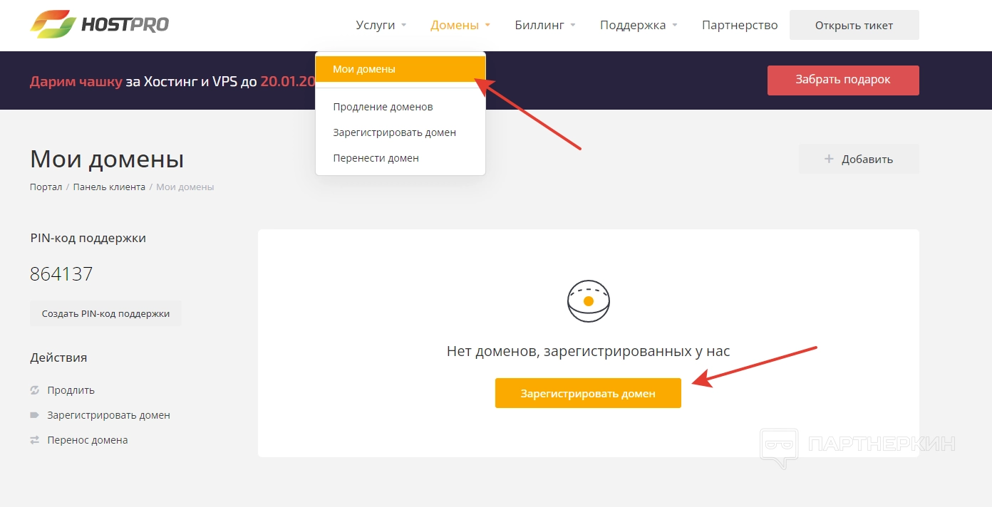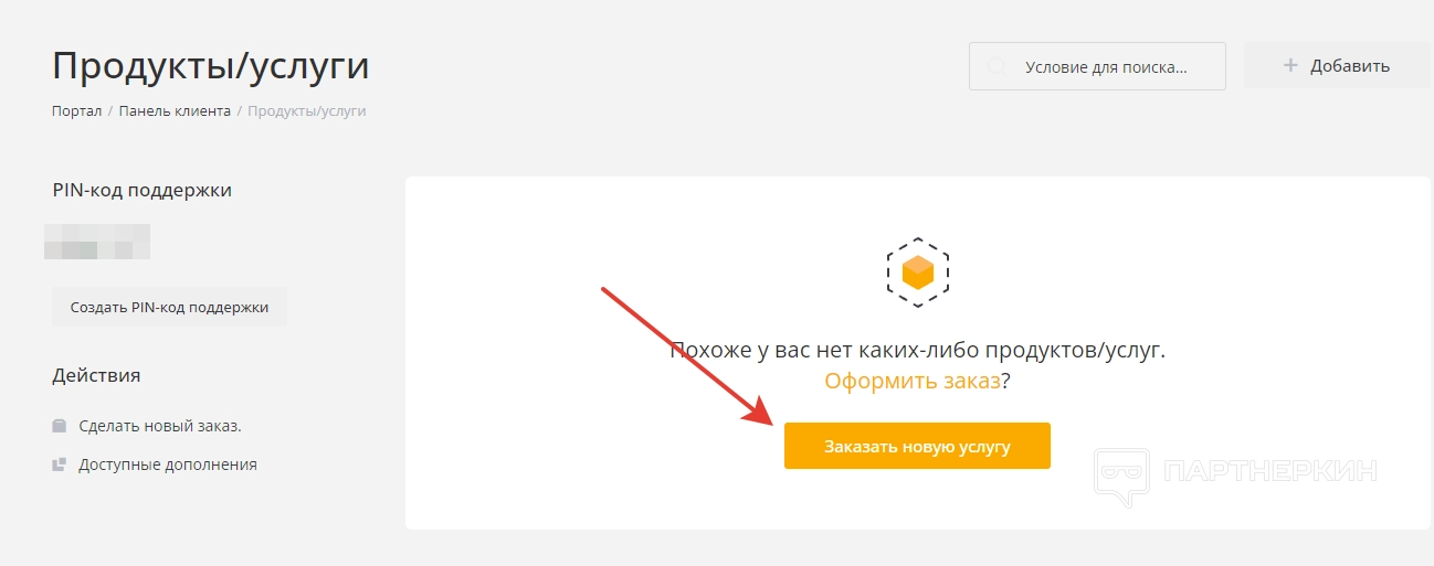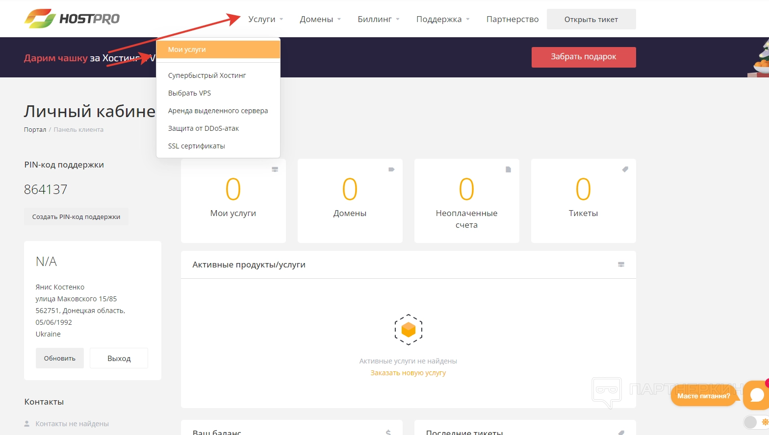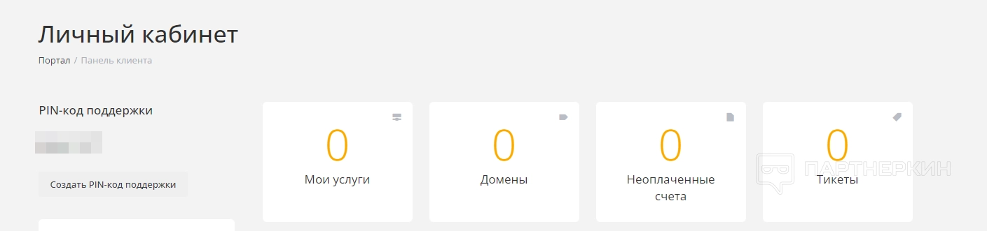 Сразу после регистрации пользователь попадет в личный кабинет, в котором будет отображаться основная информация. В верхней части экрана можно отыскать PIN поддержки, а также количество подключенных услуг, доменов, неоплаченных счетов и тикетов.