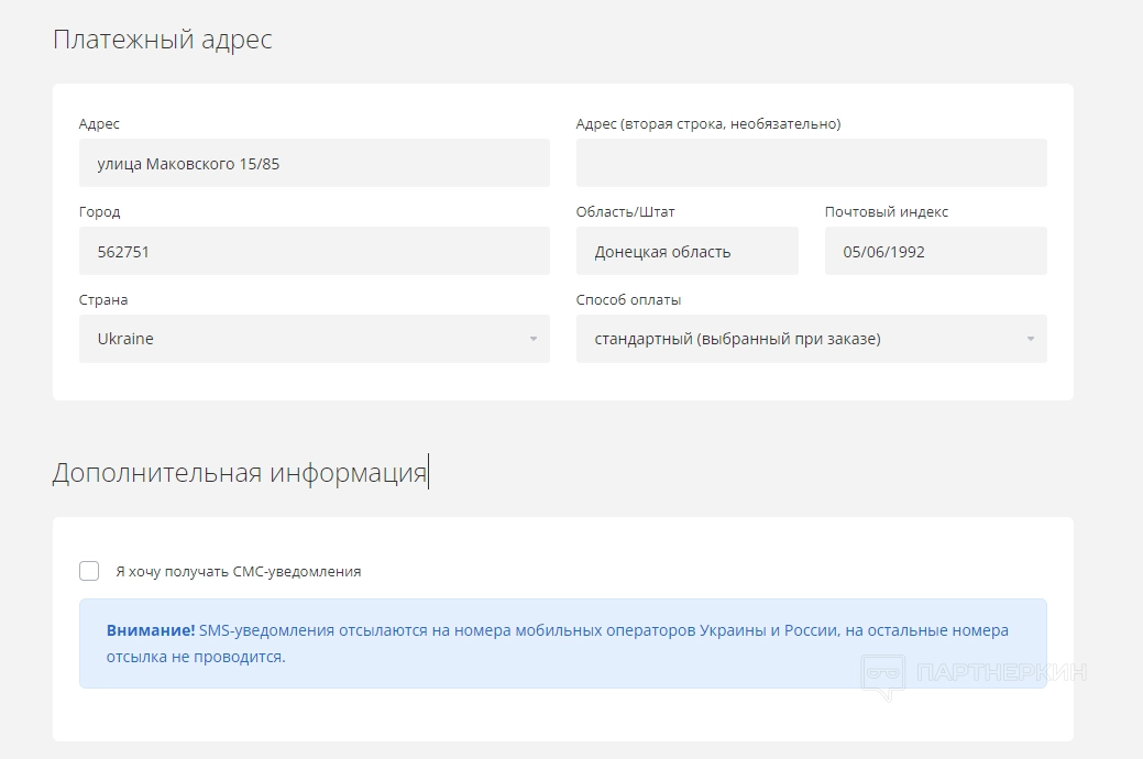Если нужно изменить персональную информацию, переходим во вкладку «Мой профиль». Там есть форма для заполнения платежного адреса и инструмент для подключения или отключения SMS-рассылки.