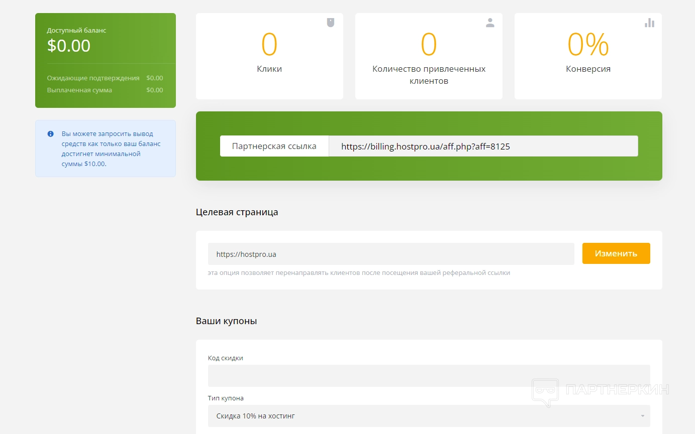 Когда пользователь активирует партнерку, на экране появится специальный раздел, где будут следующие параметры: