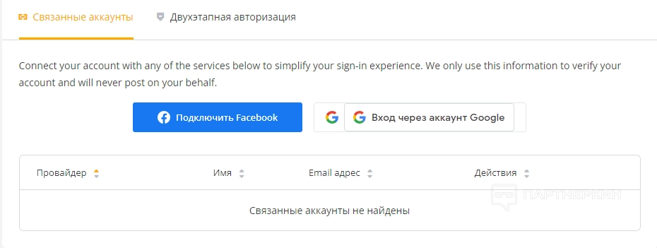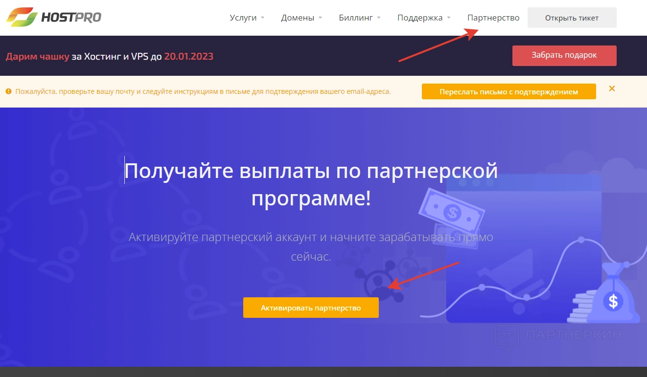 Последний раздел в панели управления — «Партнерство». В нем пользователь может найти реферальную ссылку, а также всю информацию о доходах и рефералах. Однако для начала нужно подключиться к партнерской программе. Для этого выбираем соответствующий раздел и кликаем на кнопку «Активировать партнерство».