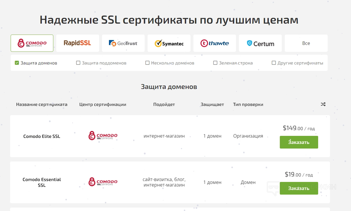 - SSL-сертификаты . В этой вкладке можно найти надежные сертификаты от 6 разных центров сертификации.