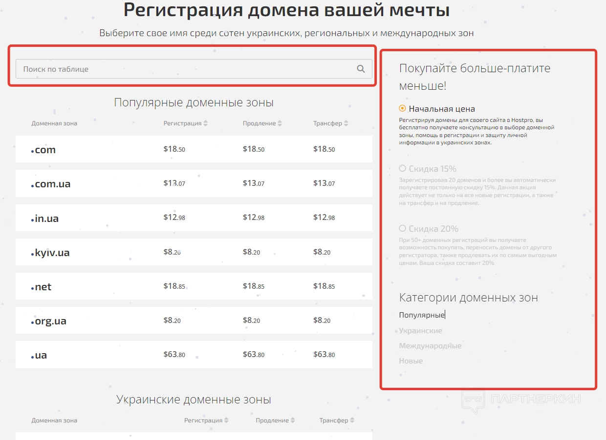 - Зарегистрировать домен. Страничка содержит поисковую строку, а также каталог популярных, международных, украинских и новых доменных зон. Есть система фильтрации, сортирующая домены по начальной цене и скидкам.