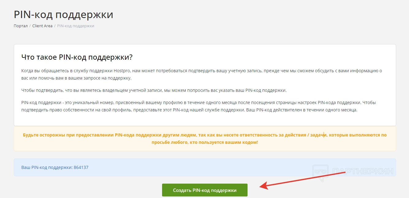 - PIN-код поддержки. В этом блоке пользователь может создать или изменить PIN-код, который отображается в личном кабинете.