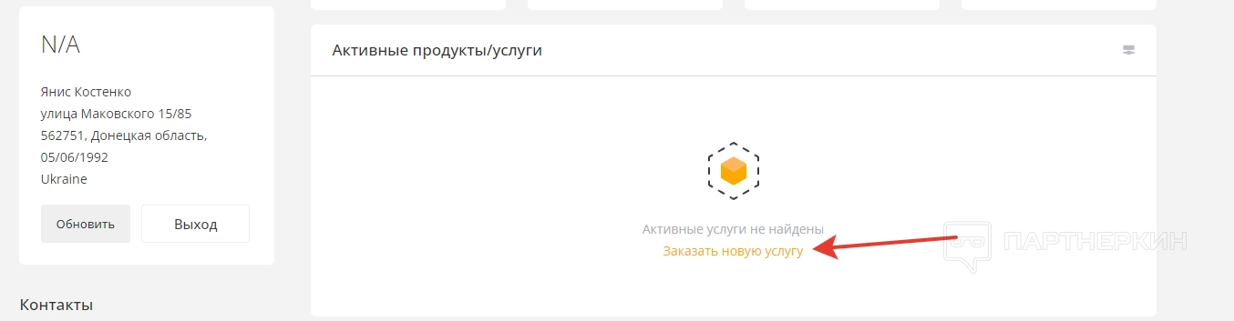 Чуть ниже находится блок с платежным адресом и раздел для добавления новых контактов. Справа отображаются активные услуги и кнопка для их подключения.
