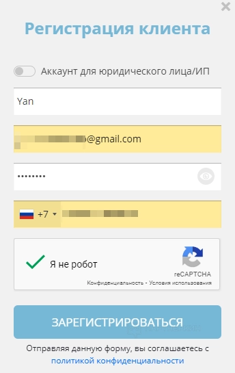 Указываем имя, электронную почту, пароль и номер телефона. В конце решаем капчу и завершаем регистрацию.