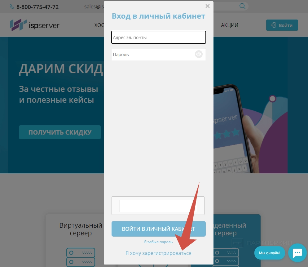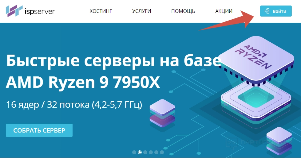 В первую очередь нужно создать учетную запись, без нее вы не сможете оформить какую-либо услугу. Для этого заходим на главную ISPserver и жмем на «Войти» в правом верхнем углу.