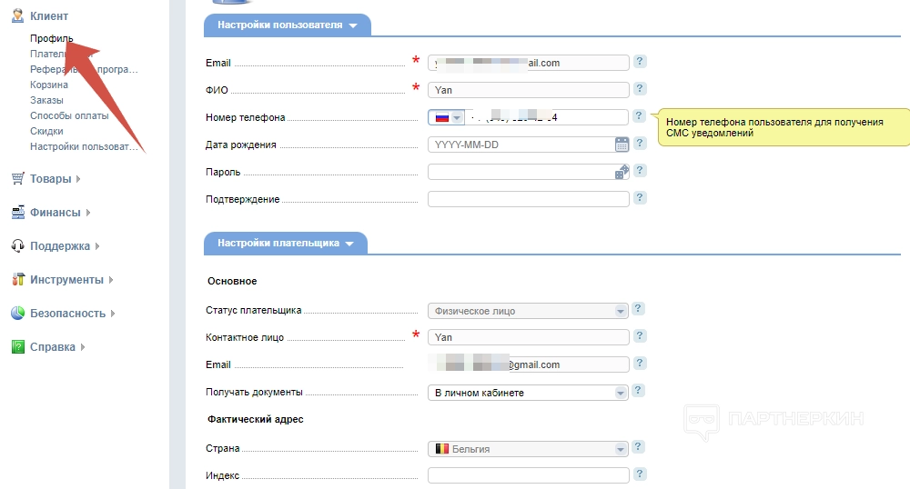 Это главный раздел с необходимой об учетной записи информацией. Здесь есть вкладка «Профиль». В ней нужно заполнить анкету с персональными и платежными данными, благодаря которой вы и сможете оформлять услуги.