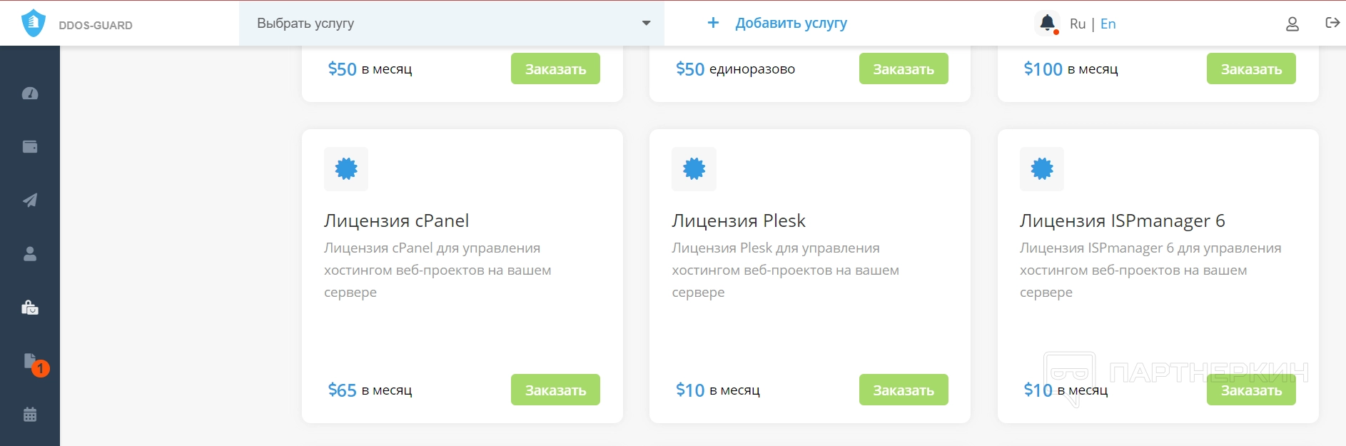Помимо услуг по защите и ускорению сети есть также услуги для хостингов и серверов, которые пользователь приобретает на сервисе. В основном, они включают подобные услуги, но также есть и другие — приобретение различных лицензий. Например, под панель управления Plesk, ISPmanager 6 или cPanel.