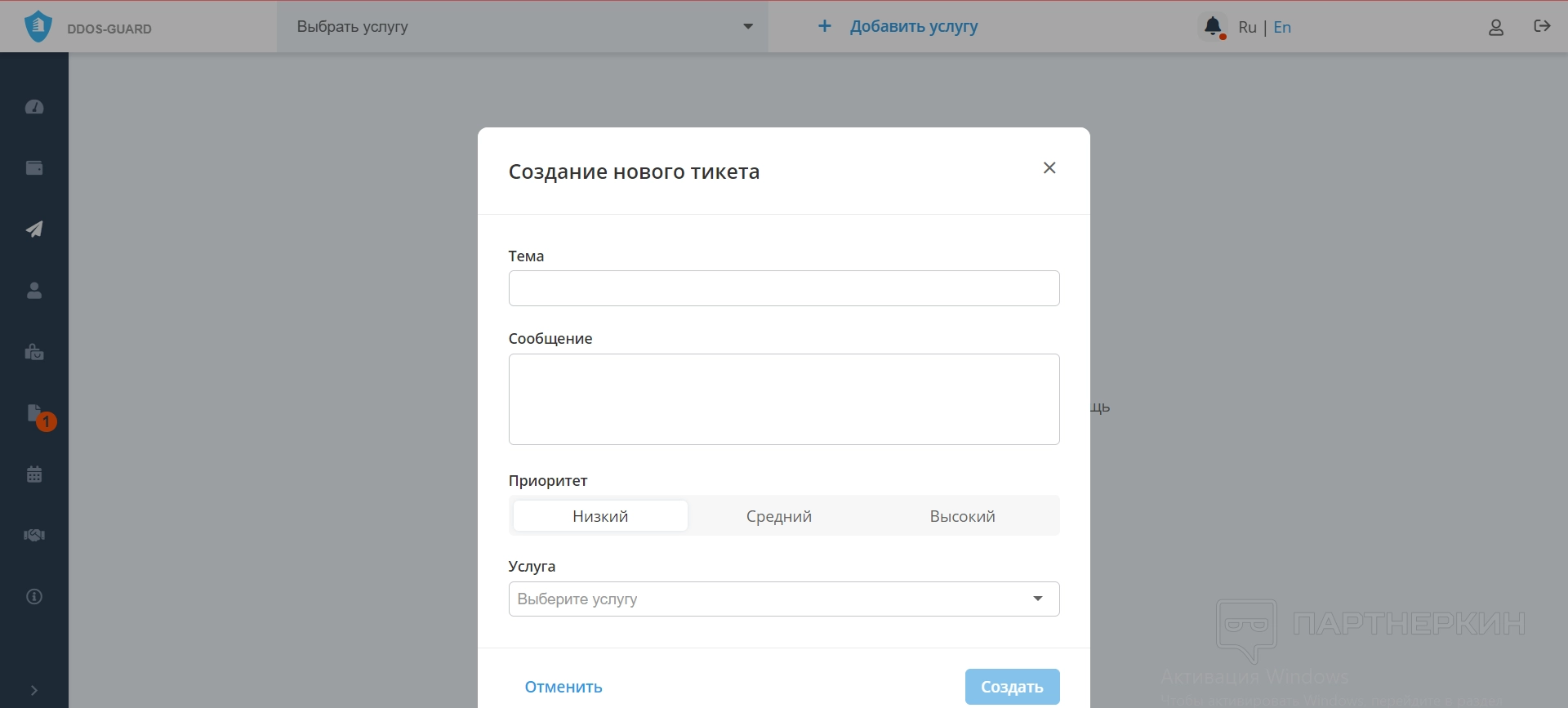 Чтобы создать новый тикет, нужно указать тему обращения в поддержку, само сообщение с подробным описанием проблемы, приоритетность вопроса, а также услугу, из-за которой произошло обращение.