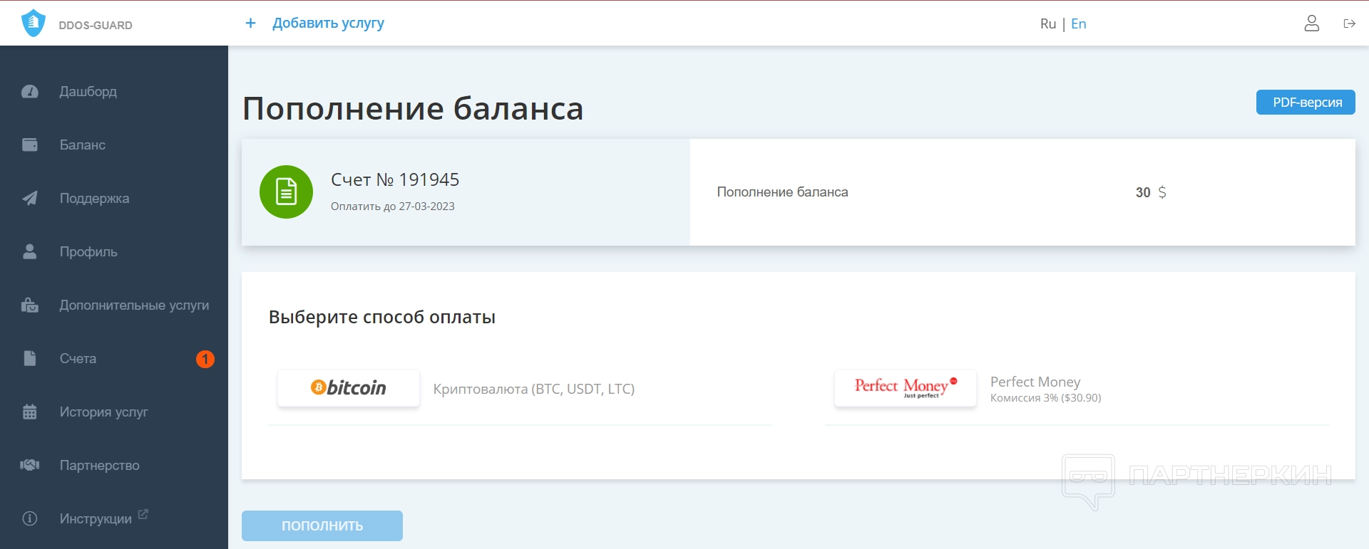 После этого откроется страница, на которой можно пополнить баланс — предлагают варианты оплаты при помощи криптовалюты и Perfect Money.