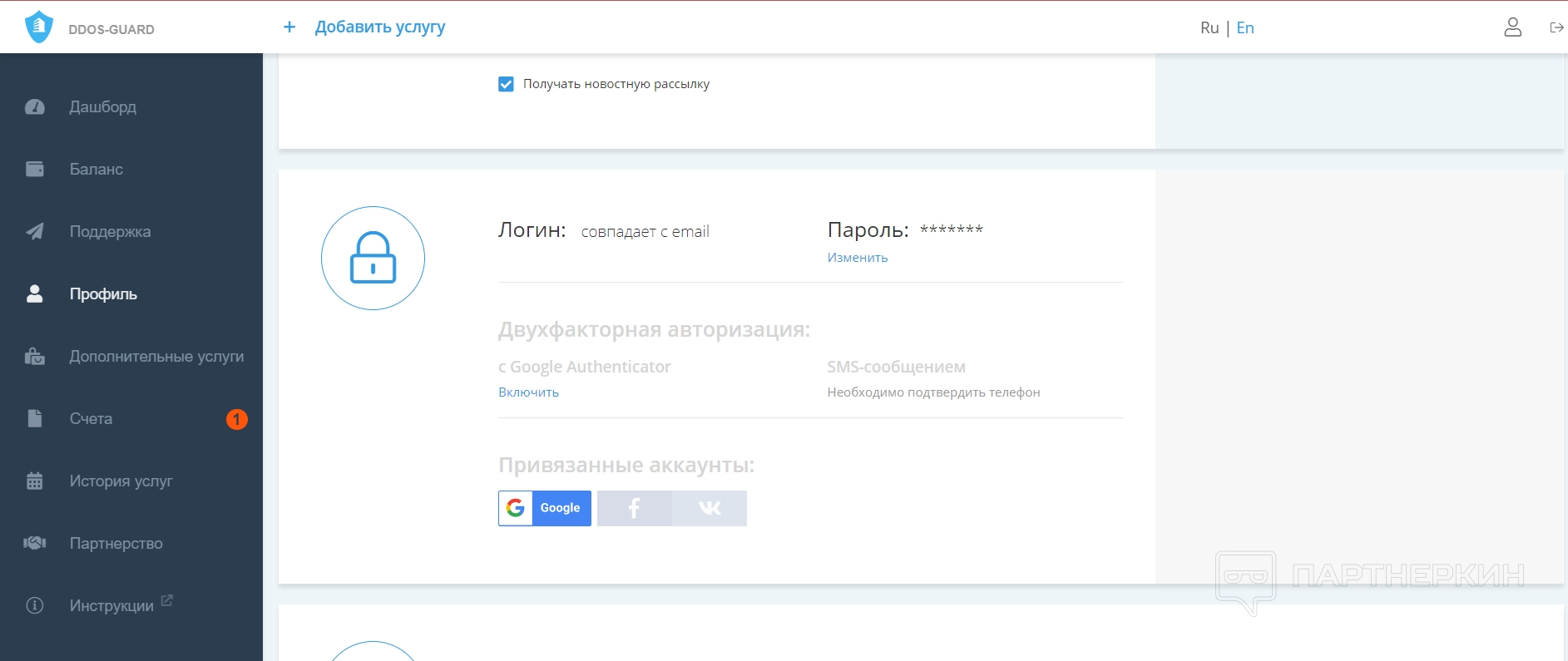 Профиль — в этом разделе пользователи могут посмотреть собственные личные данные. Здесь указываются имя, фамилия, телефон, почта,логин, пароль, привязанные аккаунты, язык, часовой пояс и валюта. Помимо этого, можно здесь также подключить двухфакторную авторизацию через Google Authenticator или через SMS-сообщение. Все данные можно изменять без проблем.