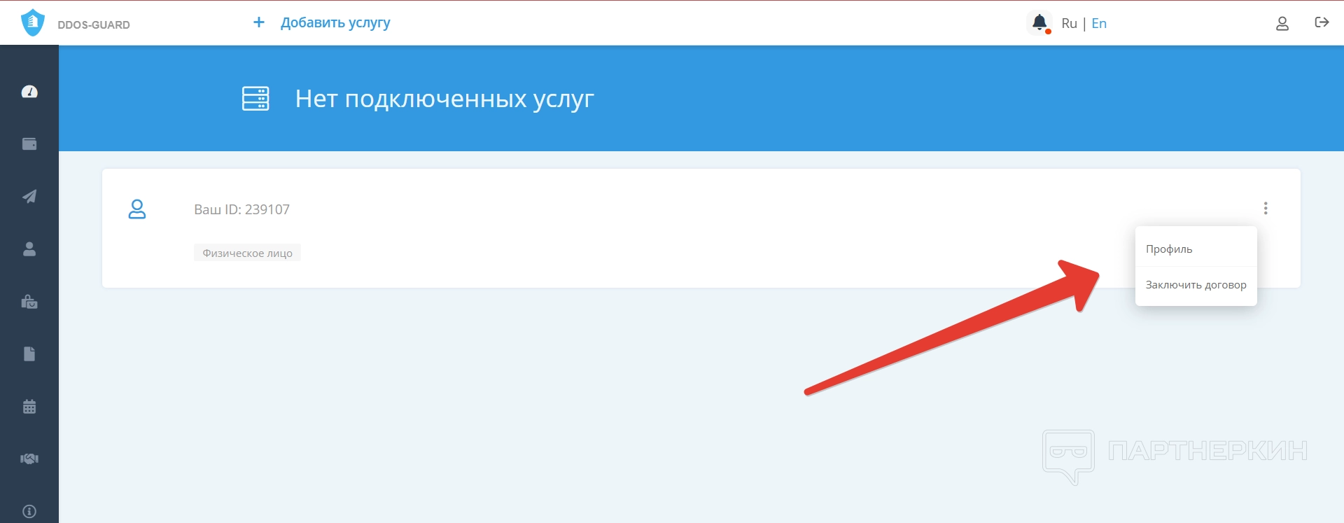Дашборд — основной раздел, в котором указываются данные пользователя. Система прописывает ID, а также тип пользователя. Более подробную информацию можно посмотреть в профиле, а также ее там можно изменить. Кроме того, здесь можно выбрать и другое предложение — заключение договора с платформой.