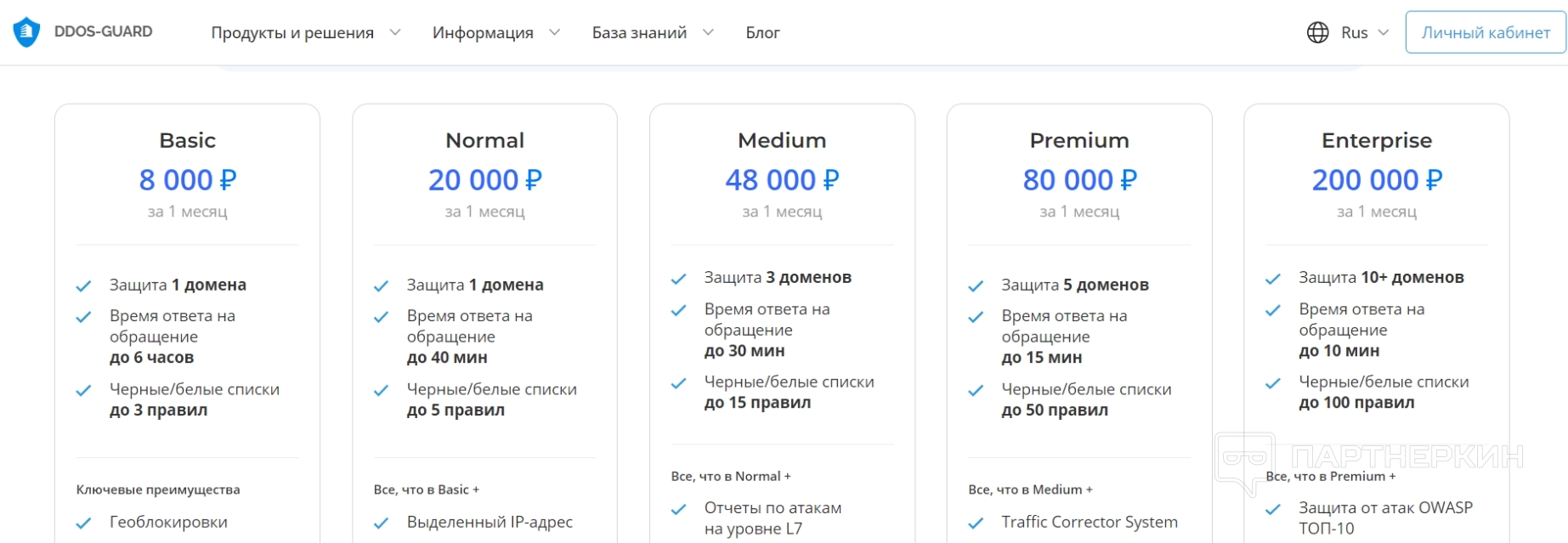 Защита веб-сайта — при оформлении данной услуги придется выбрать тариф. Доступны пять разных тарифов под разные категории пользователей — базовый, нормальный, средний, премиум и для предприятий. Разница между ними в количестве доменов, которые можно защитить от атак, а также в количестве правил для белых и черных списков. Кроме того, улучшенный тариф позволяет быстрее получать ответы после обращений.