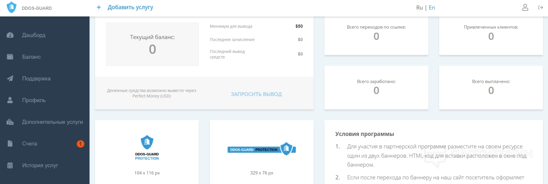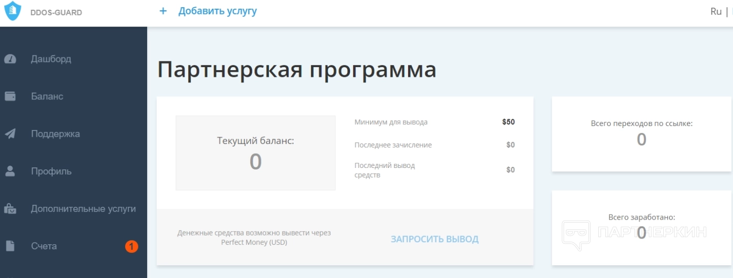 Также пользователи могут посмотреть состояние баланса по партнерской программе в этом разделе — показываются текущий баланс, максимальная сумма к выводу и размер последнего вывода. Также отображают информацию о переходах по ссылке, сколько клиентов было привлечено, и сколько всего за них выплачено.