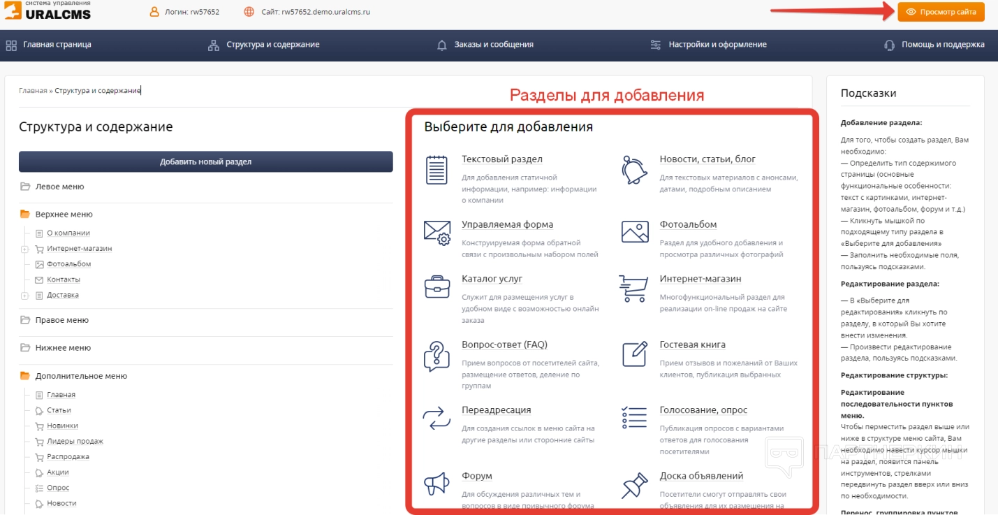 - Управление структурой и навигацией . UralCMS позволяет легко организовать структуру сайта, создавая страницы, разделы и меню. Можно настраивать иерархию страниц, добавлять ссылки на другие разделы и облегчать навигацию по сайту для пользователей.