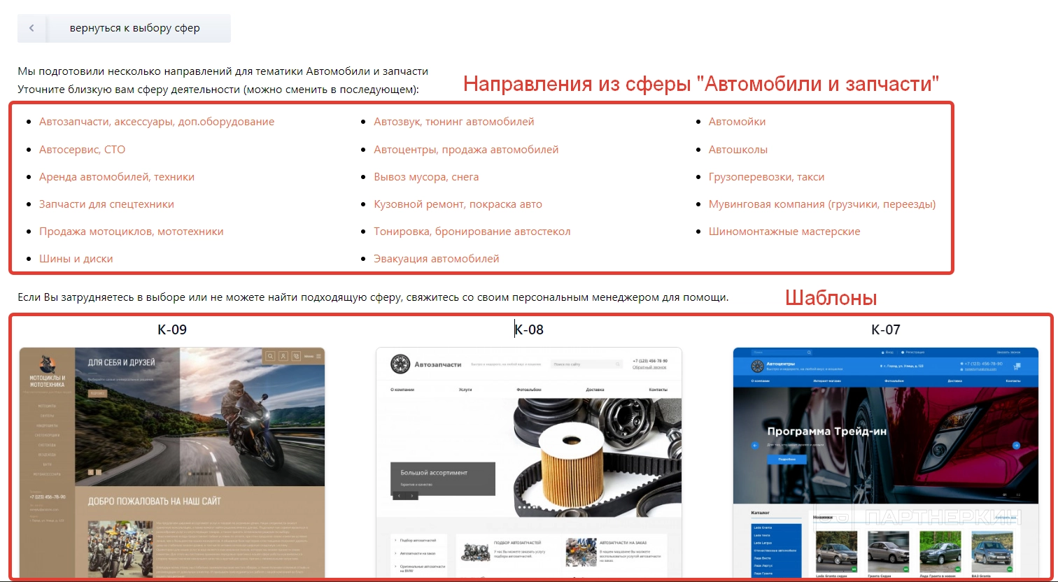 Когда вебмастер выберет нужную сферу, на экране появится ассортимент подходящих для сайта шаблонов. Так как шаблонов много, они разделены по направлениям. Пользователю нужно определиться с направлением и кликнуть на подходящий шаблон.