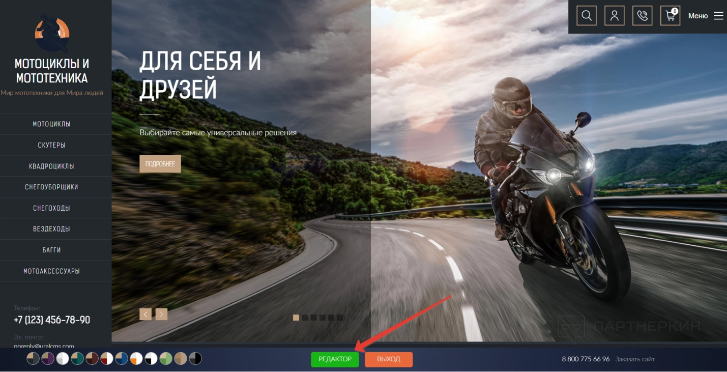 Откроется редактор, с помощью которого вебмастер может добавлять различные разделы, а также вносить изменения в настройки и цветовое оформление. Все разделы отображаются в правой части экрана. Когда все изменения будут внесены, возвращаемся на демо-сайт, кликнув на «Просмотр сайта».