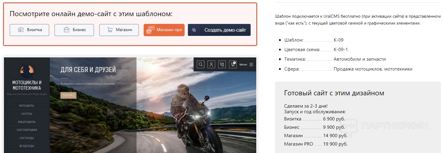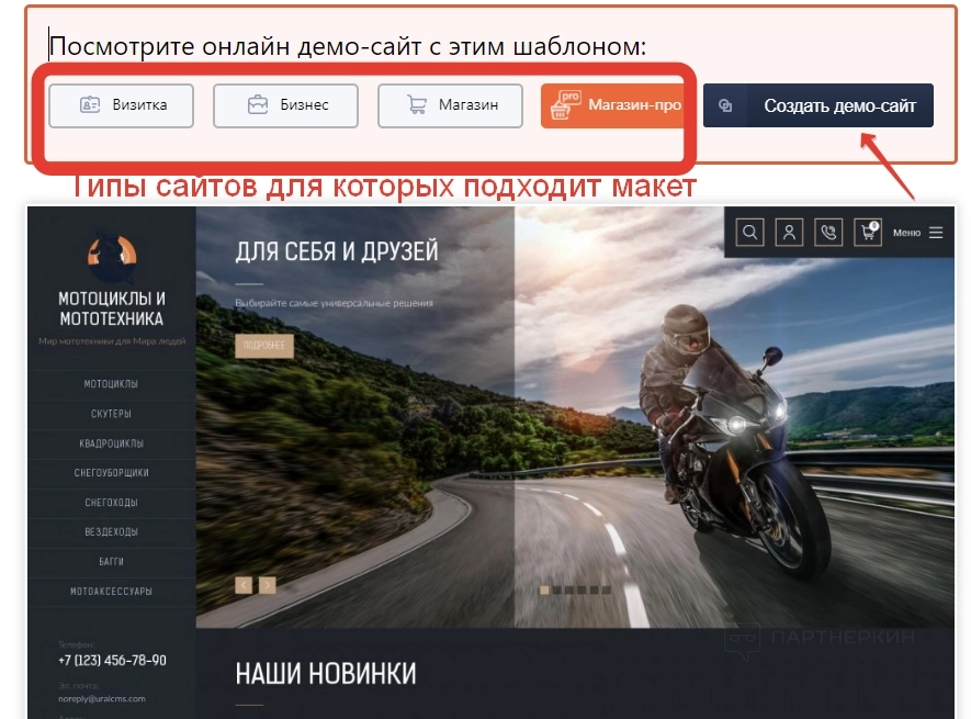 Далее откроется страница с выбранным макетом и типами сайтов, для которых этот макет может подойти. Чтобы ознакомиться с шаблоном поближе, жмем на кнопку «Создать демо-сайт».