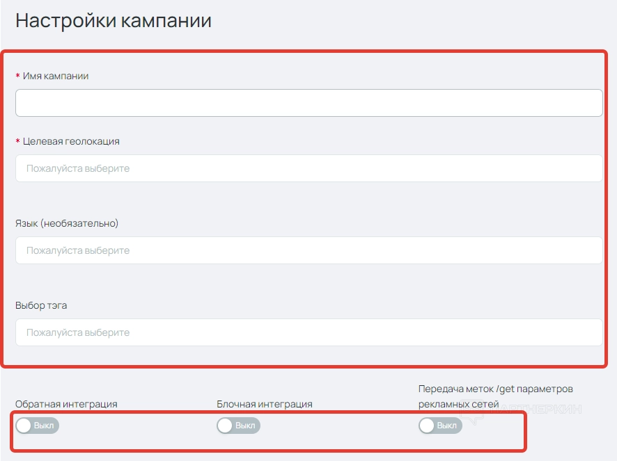 Также есть тумблеры для включения обратной интеграции, блочной интеграции и передачи меток.