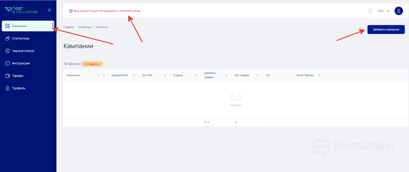 - Кампании — тут создаются и отображаются кампании;