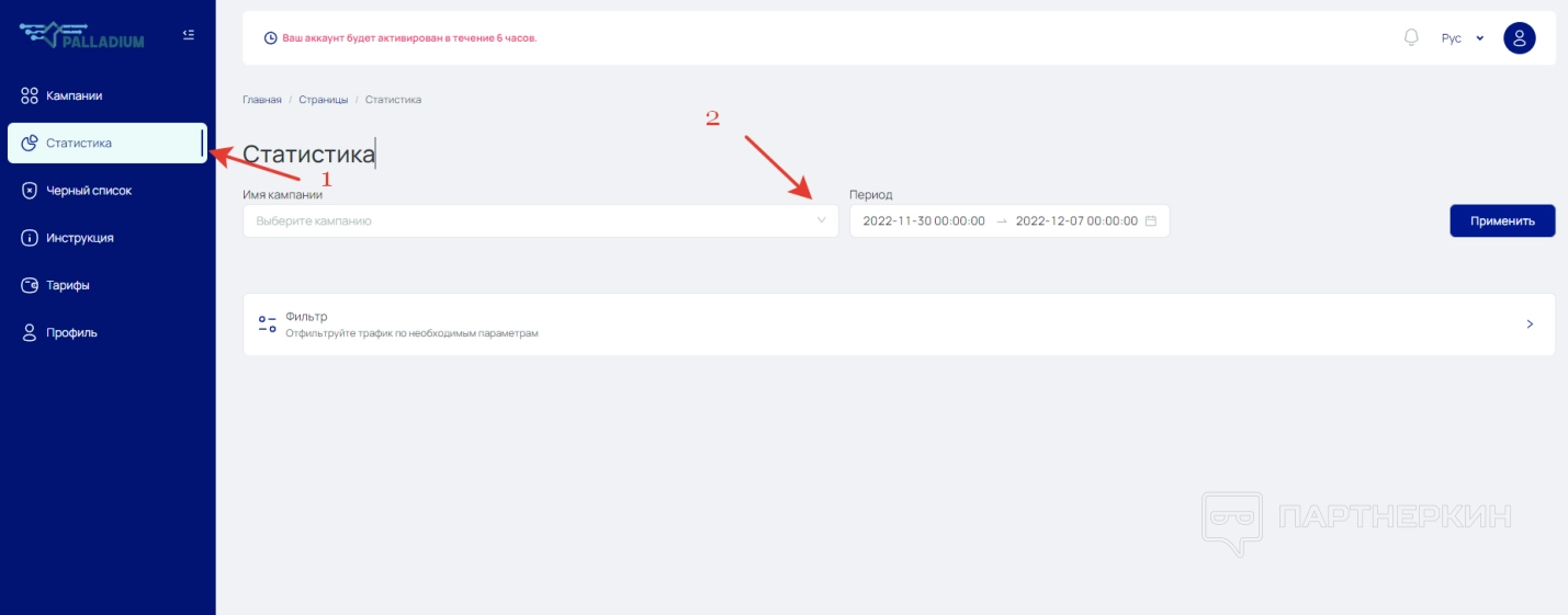 В разделе «Статистика» пользователь сможет работать с отчетностью по той или иной кампании. Для этого нужно перейти в соответствующий раздел и выбрать название в специальной строке. При необходимости можно указать конкретный период и отфильтровать параметры трафика. Корректирование фильтра осуществляется по параметрам, указанным выше.