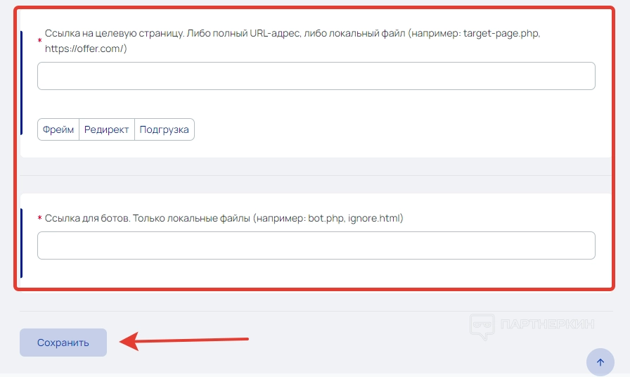 В нижней части экрана нужно указать ссылку на целевую страницу. При необходимости можно прикрепить локальный файл в формате .php. Еще есть возможность вставить ссылку для ботов в виде файлов .php или .html.