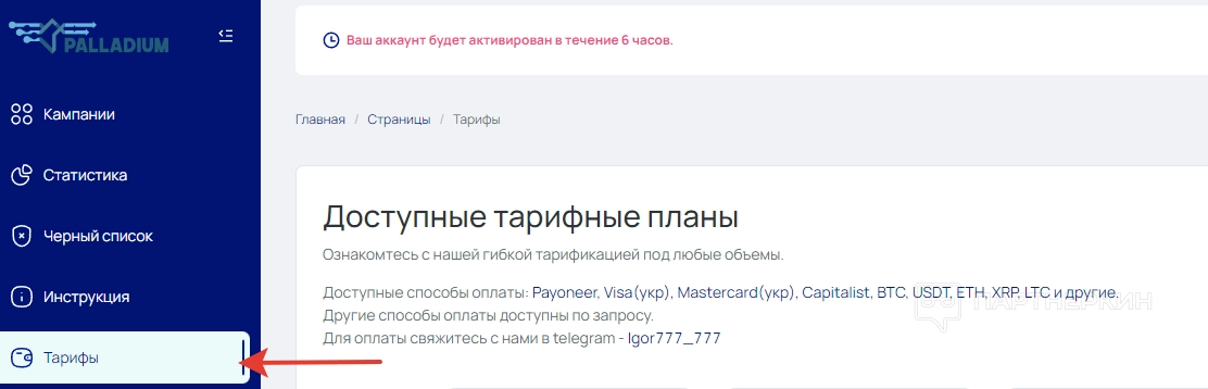 Чтобы выбрать тарифный план, переходим в раздел «Тарифы». В верхней части экрана можно найти информацию о доступных способах оплаты и имеющихся пакетах. Обращаем внимание, что система поддерживает карты только украинских банков.