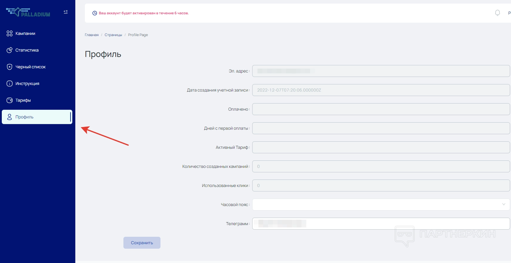 Если нужно изменить настройки аккаунта, переходим в раздел «Профиль». Там можно поменять часовой пояс и перепривязать страничку из Telegram. Также в разделе отображается следующая информация: