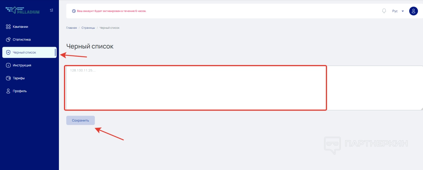 Раздел «Черный список» позволяет хранить нежелательный трафик. Чтобы внести этот трафик в blacklist, необходимо зайти в раздел и вписать IP в указанное окно. Далее жмем кнопку «Сохранить».
