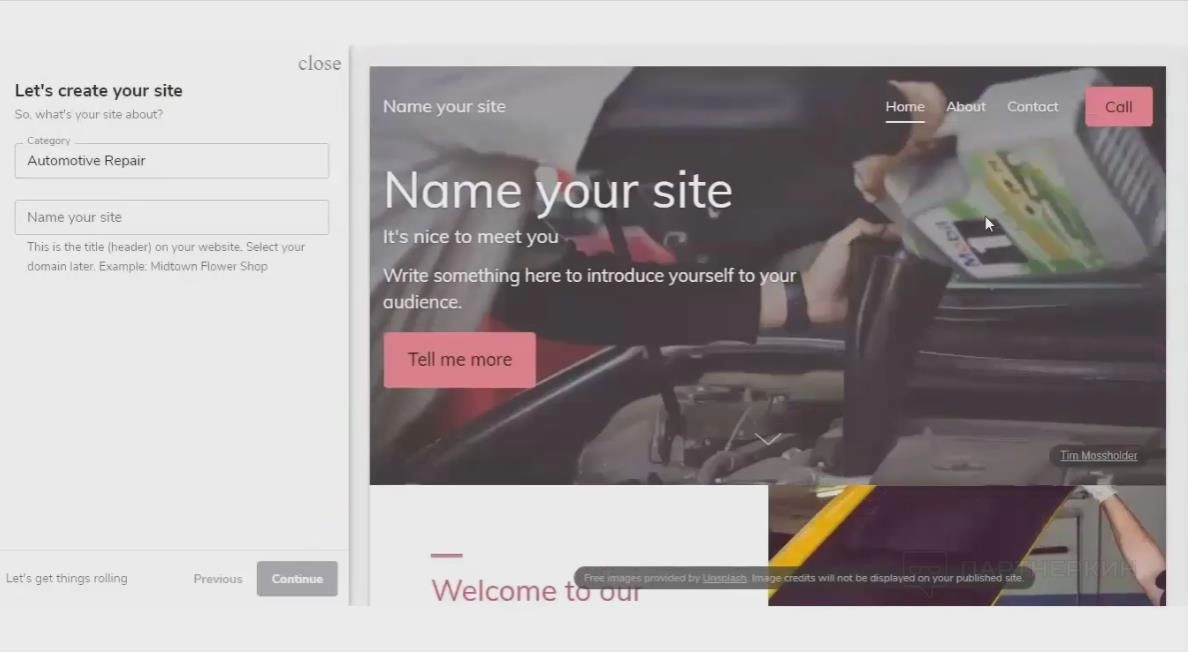 AI-помощник автоматически подберет шаблон, наиболее подходящий для указанной рубрики. Если выбор вас устраивает, укажите название сайта в строке Name your site и кликните Continue. Чтобы установить другой стиль оформления, нажмите Close или Previous и просмотрите доступные шаблоны.